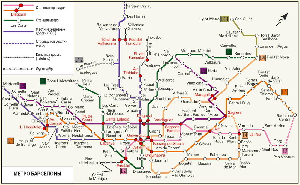 Карта метро Барселоны состоит из 11 линий. С помощью метро можно добраться даже в самый далекий уголок провинции. Одна из линий находится в стадии строительства. Когда линия будет закончена, то она станет второй по длине в Европе (около 43 километров). Также городской железнодорожный маршрут способен доставить вас с центра в окраины города и другие провинции Каталонии. Расположенный метрополитен в городе, один из самых быстрых и удобных средств передвижения.