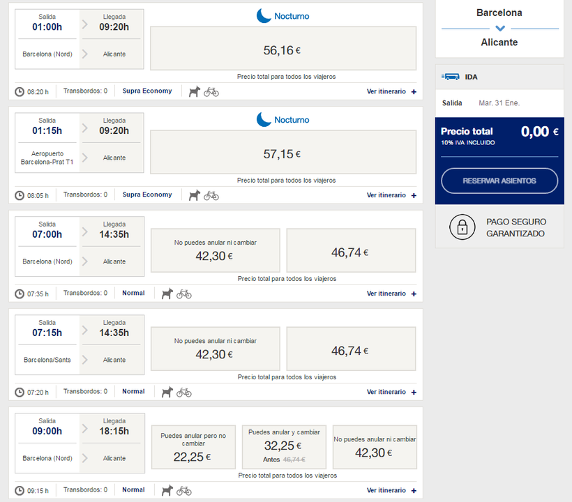 Чтобы цена не превышала эти 54,33 € и, фактически, чтобы она снизилась до 15,00 €, у нас есть разные варианты, которые очень легко применять, если у нас есть некоторая гибкость и мы можем адаптироваться к ним, но если это не ваш случай, просто помните, что максимальная цена , 76,60 € , все еще очень дешевая сумма.Мы всегда предлагаем путешествовать по лучшей цене с нашими билетами на поезд Барселона — Аликанте.