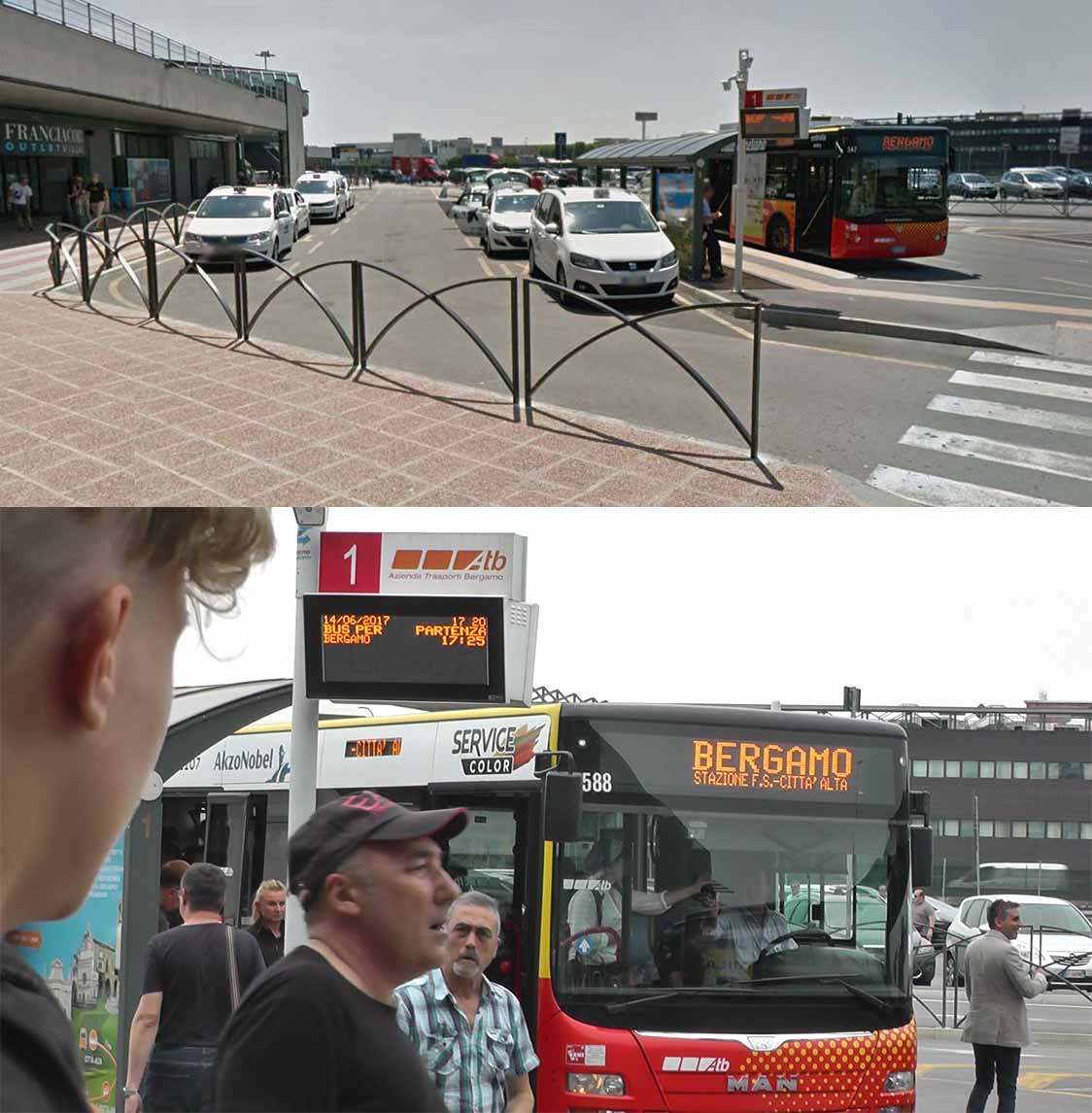 1). Автобусы компаний Terravision, Autostradale и Orioshuttle, которые доставят вас из аэропорта до центрального железнодорожного вокзала Милана. График движения: с 04:00 до 00:45 каждые 20-30 минут. На автобусах ATB можно доехать до железнодорожного вокзала Бергамо с 05:17 до 00:31. Днём ходят каждые 20 минут, а после 21:00 интервал составляет 1 час. Автобусная остановка находится у выхода из Терминала 1. Проездные билеты можно купить в кассах аэропорта либо непосредственно у водителя;