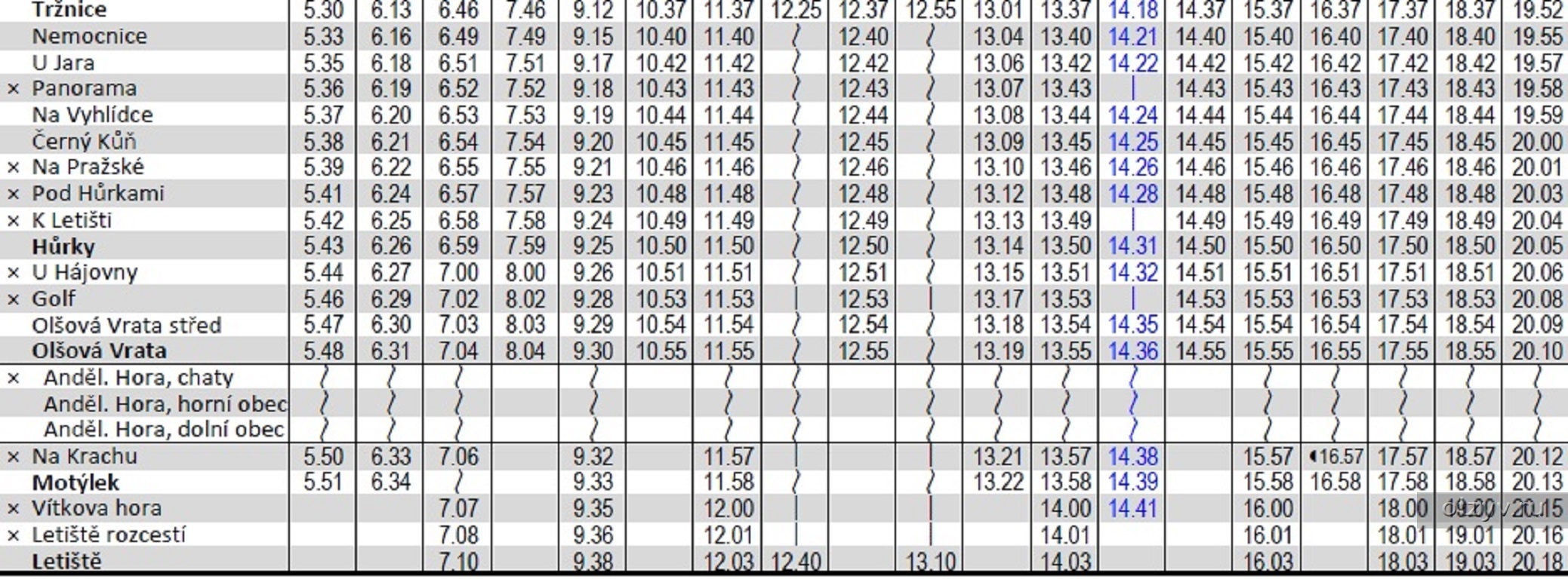 Он идет через деревню Ольшова Врата до остановки «Рынок» (Tržnice) в центре города. Первый рейс в 05:10, последний в 22:17. Смотреть расписание.