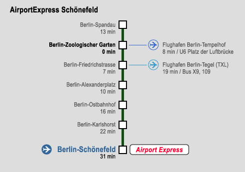 С 4:30 до 23:00. региональные поезда RE7 и RB14 под названием «Airport Express» курсируют с 30-минутными интервалами между аэропортом Шенефельд и Берлином-Шарлоттенбург с остановками на Остбанхоф, Александерплац, Центральном вокзале Берлина и Берлинском зоопарке. Поездка на поезде Airport Express до Восточного вокзала занимает около 15 минут, а до Центрального вокзала Берлина — 30 минут.