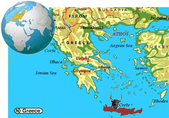 На востоке берега Греции омывает Эгейское море, на западе – Ионическое, на юге – Критское и Средиземное. Греция на карте мира граничит с такими государствами, как Албания, Болгария, Турция и Македония.