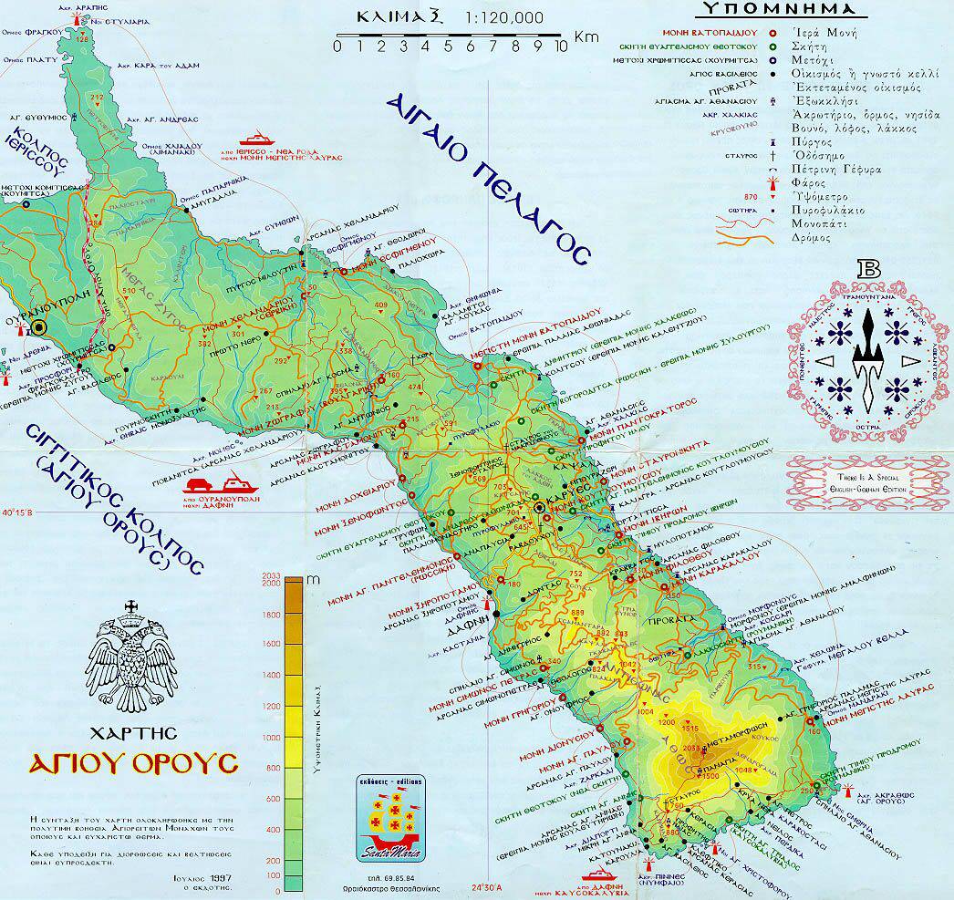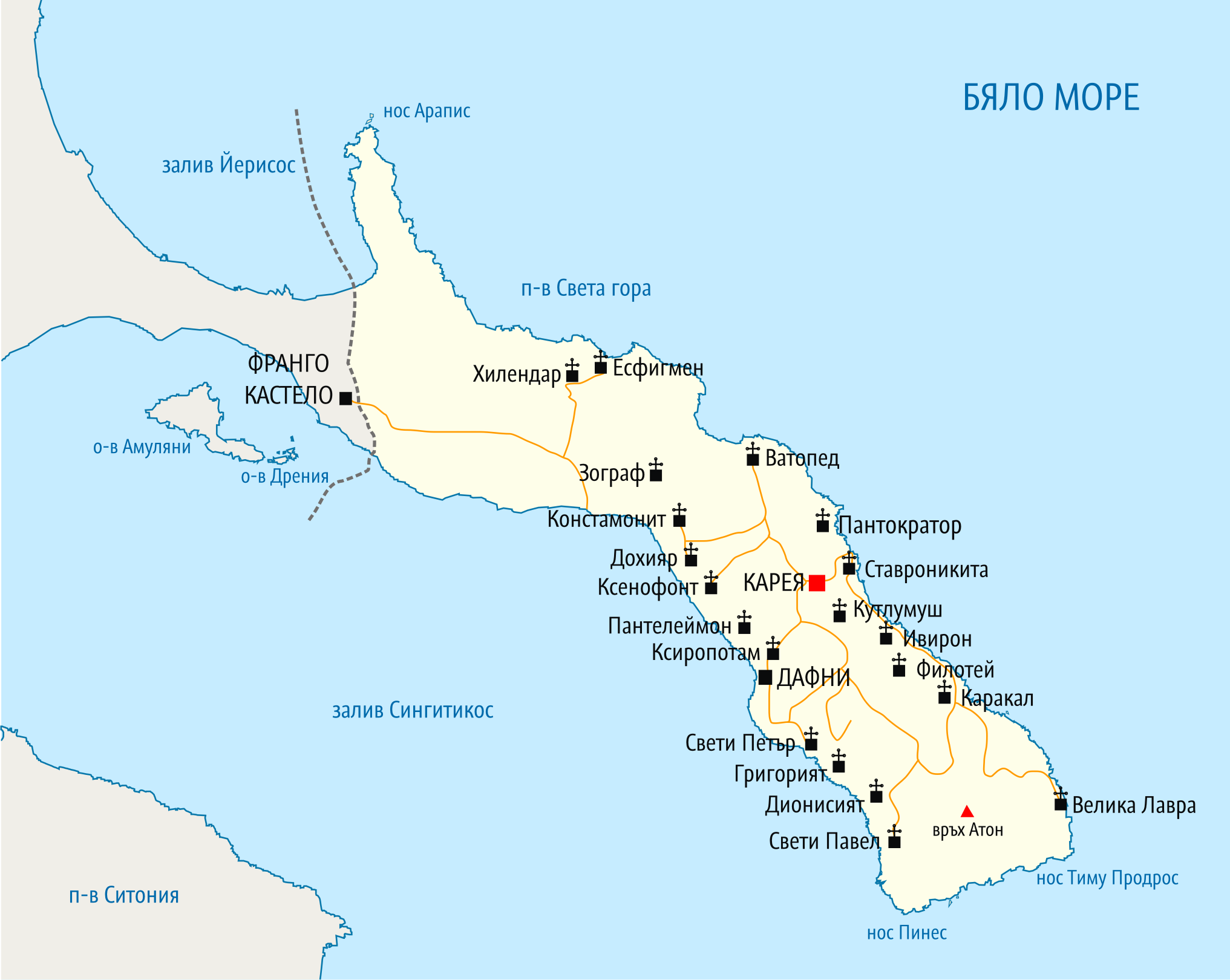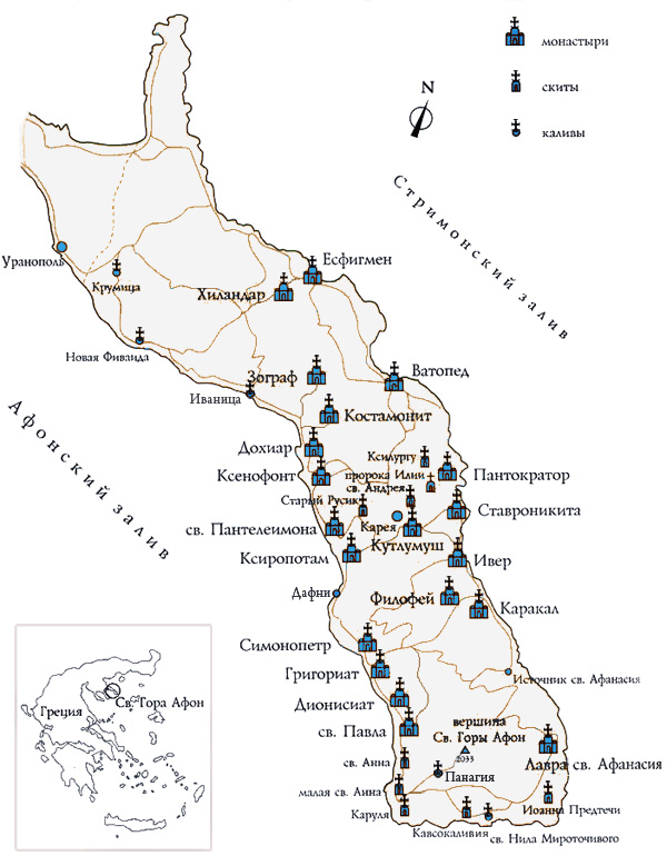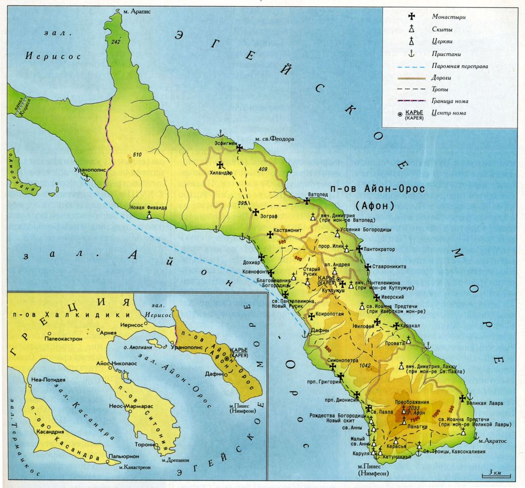Монастырь Ксенофонт был впервые построен в 10 веке Несмотря на свою 30-мильную длину, на Афонском полуострове нет официальных дорог, только грунтовые дороги, прорезающие густые леса и крутые склоны. Подобно Ватикану в Риме, Афон является самоуправляемой религиозной единицей в составе греческой республики.Административный центр находится в городе Кариес, который также находится в географическом центре полуострова.