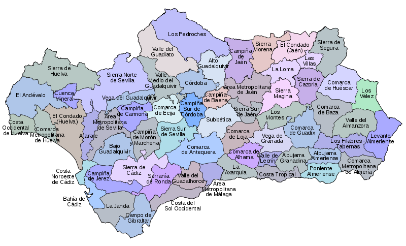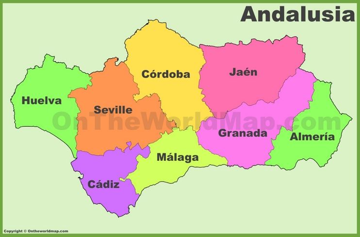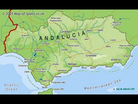 Андалусия является вторым по величине регионом в Испании и занимает площадь около 33 000 квадратных миль. Андалусия известна своей христианской и мусульманской архитектурой, жарким летом и богатой дикой природой. Андалусия — регион Испании с сильной сельскохозяйственной и промышленной экономикой. Карта Андалусии включает в себя пять рек, впадающих в Атлантический океан, и два основных горных хребта.