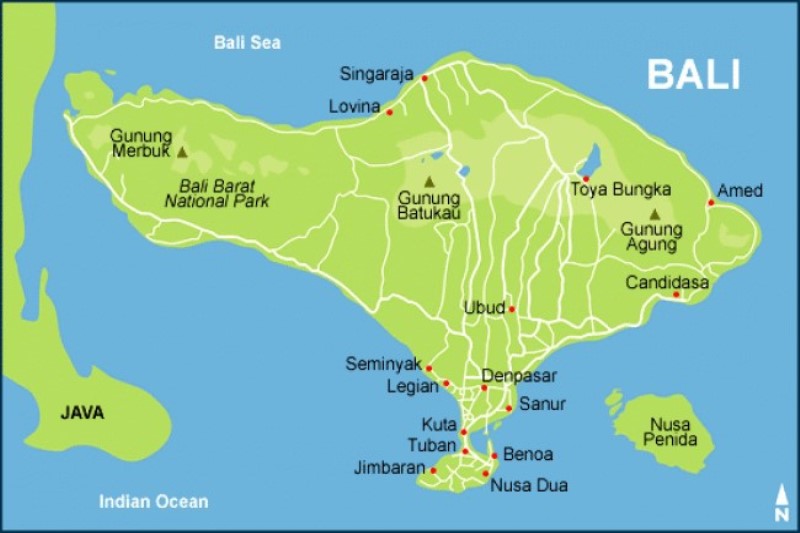 Для начала выкладываю карту Бали, чтобы вам было легче понять, что где находится. Бали – это остров Индонезии, размером 145 на 80 км.