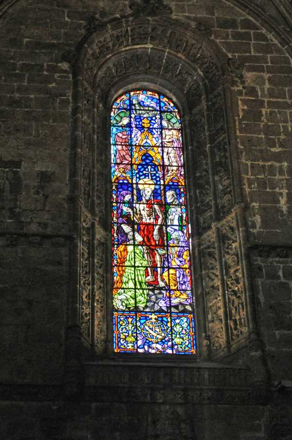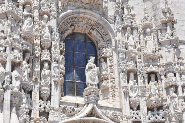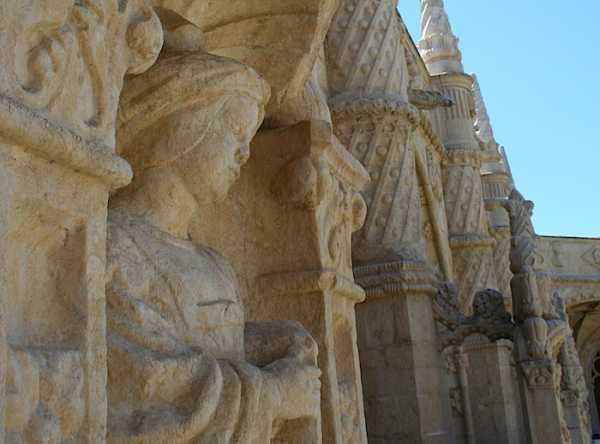 Мы вошли в церковь через западный портал. Скульптуры этого портала, созданные Никола Шантереном, изображают Марию Кастильскую, вторую жену Мануэла I, и Иоанна Крестителя. На левой стороне увековечен сам монарх со своим святым покровителем Иеронимом.
