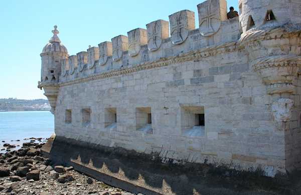 В нижней части видны амбразуры для пушек, а в верхней зубцы с крестамиПопасть в башню Белен можно по разводному мосту. Главный вход имеет прямой доступ к внутренней части бастиона, в котором находится артиллерия башни. На внешней стороне нижнего бастиона в стенах есть амбразуры для 17 пушек.