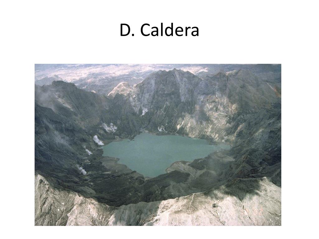 Кальдера (от исп. caldera — большой котёл) — обширная циркообразная котловина вулканического происхождения, часто с крутыми стенками и более или менее ровным дном. От кратеров отличаются гораздо большими размерами и могут иметь длину 10–20 и более километров.