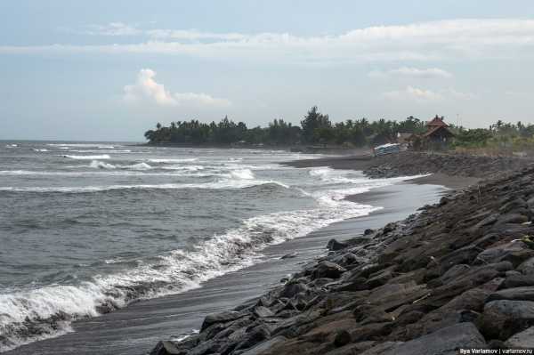 В общем, с едой проблем нет. В то утро я уселся в первый попавшийся варунг, где заказал себе наси горенг с осьминогом и свежевыжатый сок. Обошлось мне все это в 50 000 рупий, это что-то около 4$. Подкрепившись, я решил сходить до ближайшего пляжа и посмотреть на океан. Идти было совсем недалеко. Все туристические места, в которые рядовой турист попадает на Бали после прилета, находятся вдоль береговой линии. Добравшись до пляжа, я был слегка разочарован — черный вулканический песок, какие-то мангровые деревья вместо ожидаемых пальм, в общем, совсем не так, как в рекламе баунти. Да уж, подумал я и отправился обратно в отель.