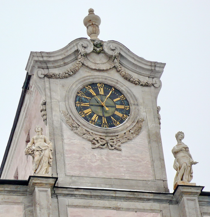 Часы помещены над центральным входом дворового фасада Мраморного дворца. Снизу они окаймлены двумя пальмовыми ветвями, пересекающимися своими черенками, и перевиты лентой. Над часами, справа и слева от них, сверху спускаются белые гирлянды. Они и делались из уральского мрамора. Из серого мрамора сделаны детали «на филёнки между средними и мезонинными окошками», «архитрав к парадной лестнице».