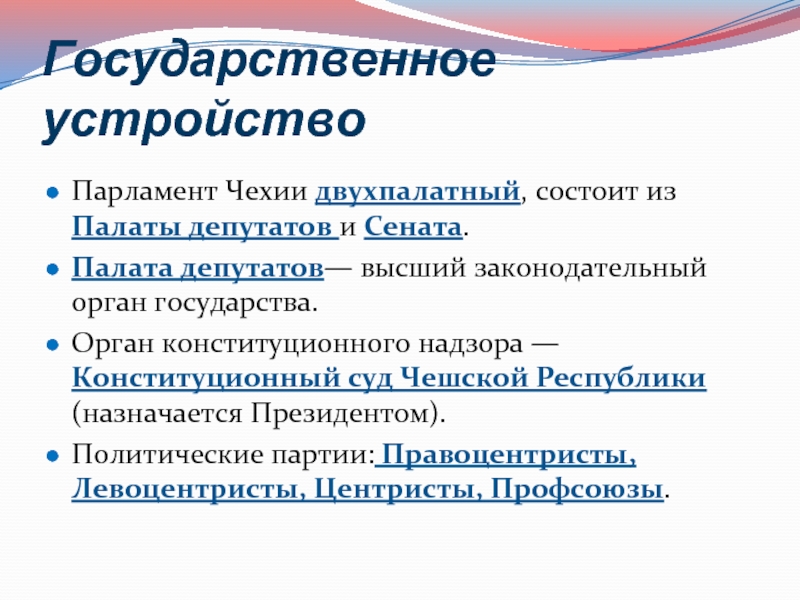 Высшим законодательным органом является Парламент ЧР, состоящий из двух палат – Сената и Палаты депутатов.