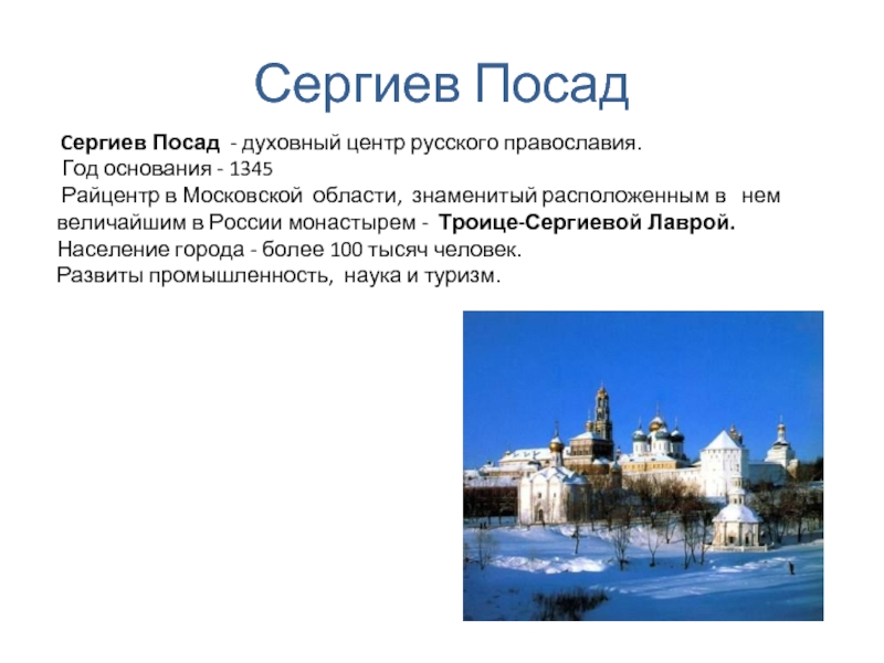 Сейчас Сергиев Посад — крупнейший административный, промышленный, культурный и туристический центр Подмосковья, жемчужина «Золотого кольца». Удобное расположение города на транспортных артериях, соединяющих регионы России с Москвой, способствует прекрасное автомобильное и железнодорожное сообщение. развитие города и района.