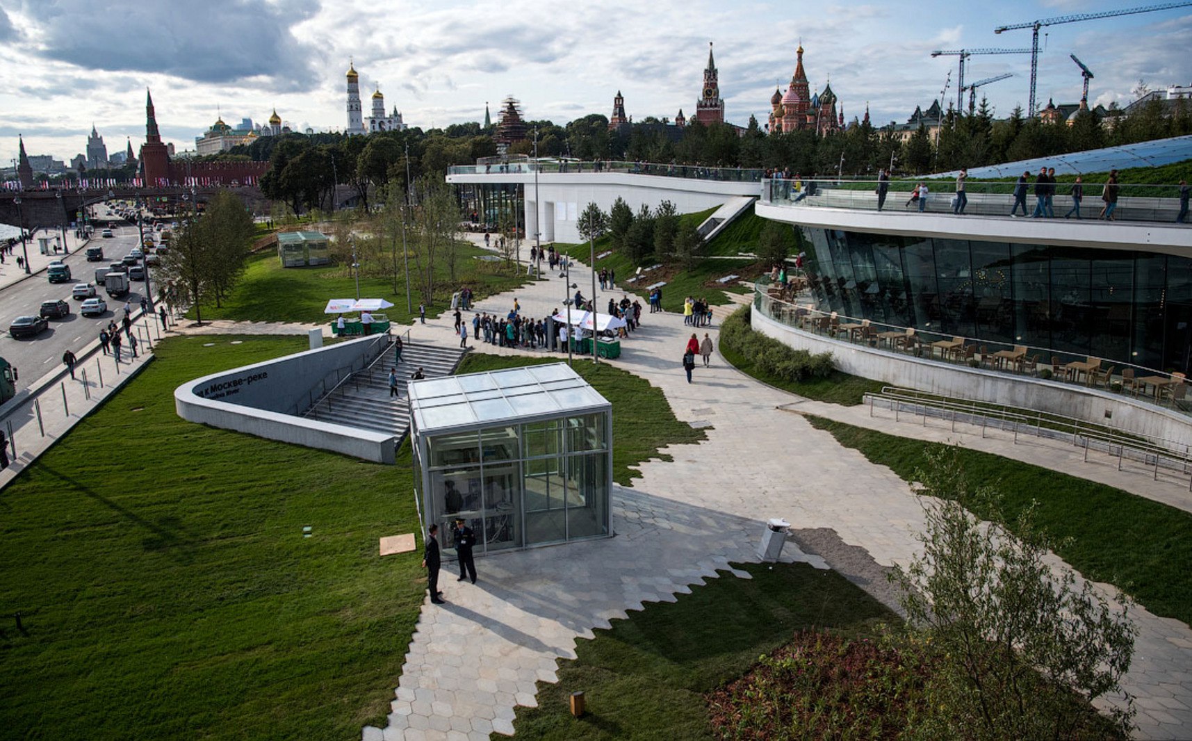 Да? И когда вот эти дорожки извилистые, холмы, когда они рисовались, там была очень важной идея в том, чтобы сделать сценарий, как ты видишь город, находясь в парке с одного места, с другого, с 3-го, с амфитеатра, с моста. И если Вы там, наверное, обратили внимание, огромное количество фотографий новых видов города возникло благодаря «Зарядью», которых раньше никто не видел и не знал, потому что мы знали, что всегда если Кремль, его фотографировали с большого каменного моста стандартно или с москворецкого, второй вариант. И собственно кроме двух этих иконических фотографий Кремля, начиная с еще живописных изображений, там не знаю, XIX века как-то мы не привыкли Кремль видеть с других точек. А парк как раз позволил сделать новые варианты взгляда на Кремль, на собор Василия Блаженного просто потому, что это площадка никогда не была свободная. Она никогда не была такой возможной для видов. То есть достаточно плоская она всегда была застроена. То есть вот с момента основания города это была 1-я площадка, которую вообще застраивали, потому что это была пристань на реке, и с нее начиналось строительство Кремля.