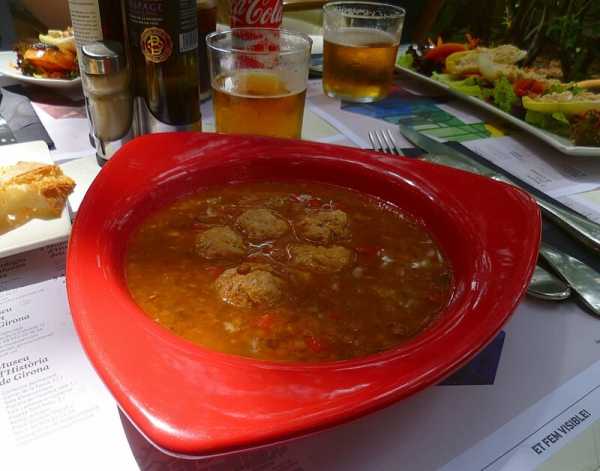 Цены в испанских кафе обычно относительно невысокие (по сравнению с той же Францией, например). Особенно, если заказывать блюда из раздела, который именуется в меню как «Menu del Dia» или «Plata del Dia» («Меню дня» или «Блюдо дня»). Это комплексный обед, в который входит первое блюдо (суп или салат), второе (обычно что-то мясное или рыбное с гарниром), хлеб. Еще иногда сюда может включаться напиток и десерт. Такой обед стоит существенно ниже, чем входящие в него блюда по отдельности. А теперь посмотрим на некоторые испанские блюда. Там, где холодно – едят горячие супы. А в Испании (где чаще всего жарко) самый известный суп – холодный. Он называется «гаспачо», и готовят его из овощей, которые перетирают до состояния жидкого пюре. Туда обязательно входят помидоры, придающие супу красноватый оттенок. Вот он, гаспачо – в плошках справа.