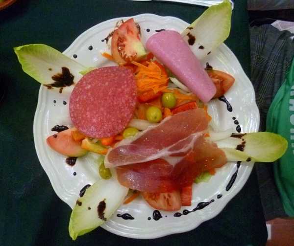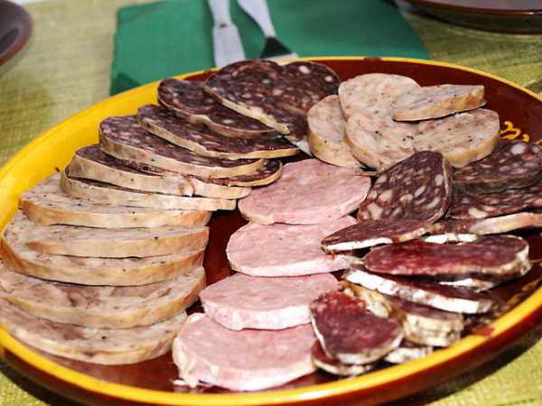 В этой тарелке – мясное ассорти. Куски мяса разных сортов, среди которых даже затесалась колбаса.