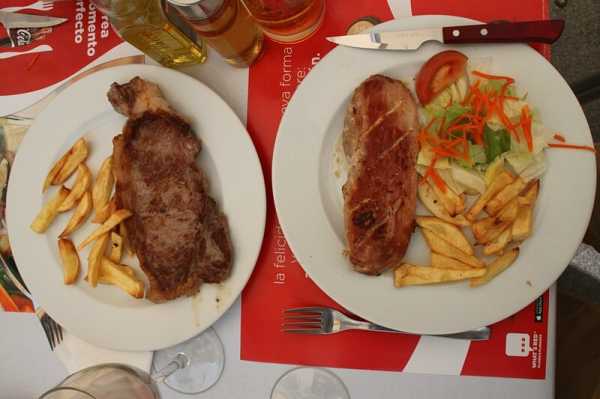 Порции у испанских блюд чаще всего совсем не маленькие… В Мадриде в приглянувшемся нам кафе мы увидели завлекательную надпись, которая гласила, что за не очень большую сумму можно заказать состоящий из нескольких блюд обед. В скобках уточнялось, что он рассчитан на 2 персоны. И таких обедов предлагалось два варианта.