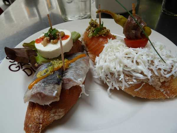 Испанские закуски носят название «тапас». Под это определение подойдут и нарезки, и бутерброды. Такое ощущение, что даже салаты здесь делаются в стиле «тапас» (а, может, это тоже он и есть). Обратите внимание – местные салаты не похожи на наши. То есть, составные части не порезаны на мелкие кусочки, не перемешаны и не сдобрены чем-нибудь типа майонеза. Всё аккуратно нарезано и художественно уложено.