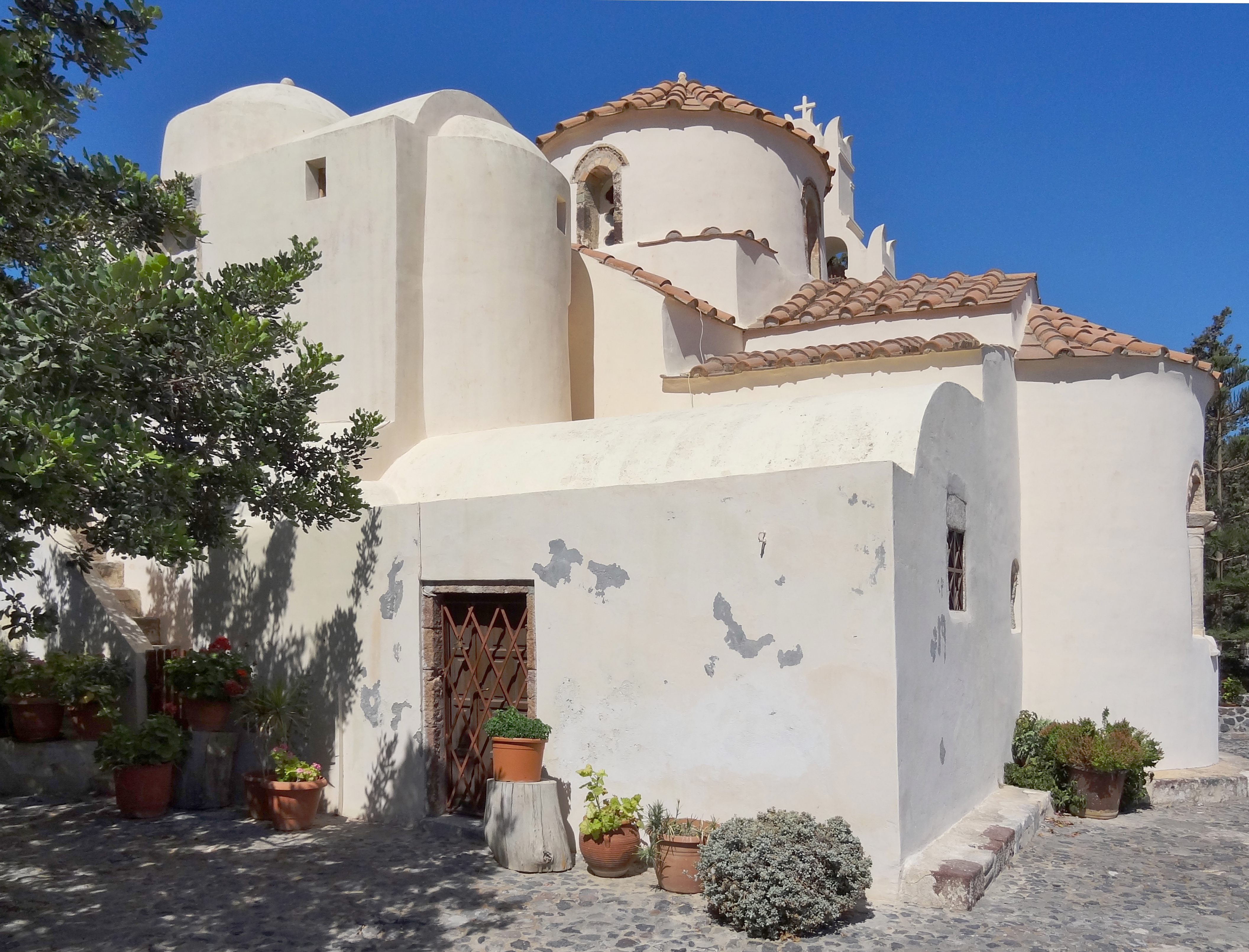 Найти церковь Панагия Хрисополитисса можно по высокой колокольне, если бы не колокольня, то обнаружить церковный двор было бы весьма сложно.