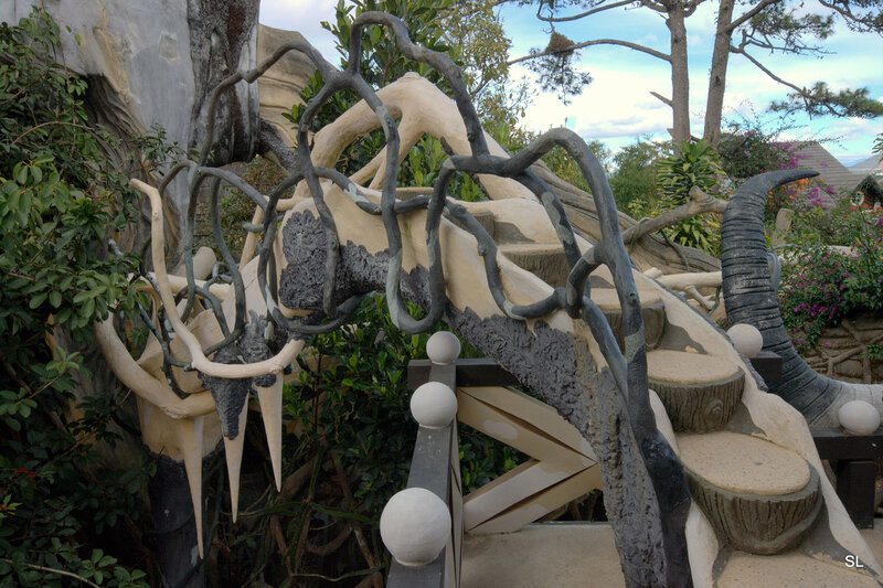 De werkelijke naam — это гостевой дом Hang Nga. Смешайте Гауди с Алисой в Стране Чудес в одном месте с редкими людьми. Он открыл истинный сюрреализм в человеческом художественном лице. Beeldhouwende kamers verbonden door bruggen, wirwar van groen waaronder jungle wijnstokken, veel kleuren en spinnenweb vensters.