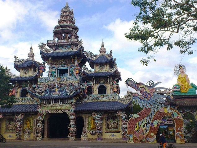 самая показная пагода во всем Далате, может быть, даже во всем Вьетнаме! Сложная плитка повсюду не похожа ни на что, что вы увидите в большинстве храмов по всему Вьетнаму.
