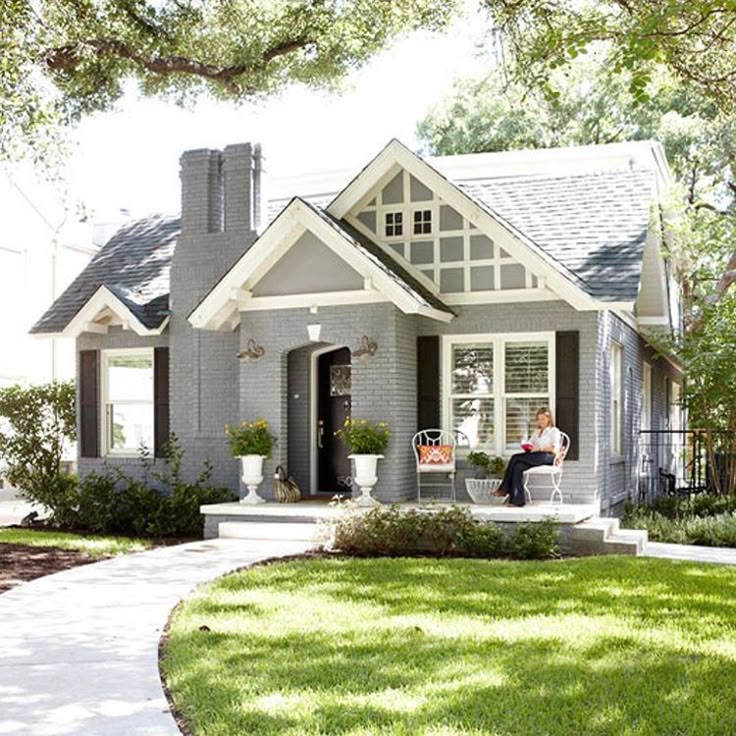 Es ist grau mit einer türkisfarbenen Tür und es gibt eine große Bordsteinattraktivität. Das Haus hat einen doppelten Vordereingang und es ist auf einem großen Grundstück.
