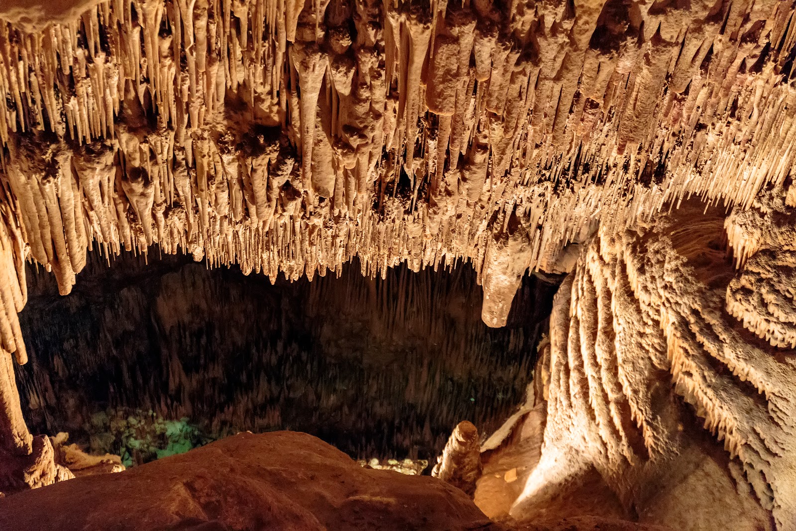 Потолок Драконьих пещер украшают сотни тонких сталактитов-игл.