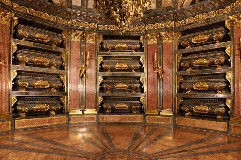 Королевские гробницы можно найти в склепе дворца в Эскориале, Испания. Это настоящее шоу элегантности. Лестница, ведущая вниз к склепу, покрыта мрамором, как и сам склеп, красиво оформленное пространство, от которого у некоторых отвиснут челюсти!