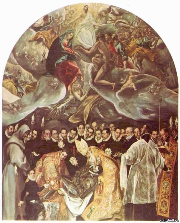 В Венеции и Риме Эль Греко овладел приемами масляной живописи, передачей пространства и перспективы, обобщенным широким мазком; особенностями венецианского колоризма. Произведения, среди которых лишь немногие признаны достоверно принадлежащими кисти Эль Греко, отмечены разнохарактерностью исканий (“Изгнание торгующих из храма”, 1570, Национальная галерея, Вашингтон; “Исцеление слепого”, 1567-1570, Картинная галерея, Дрезден; портрет миниатюриста Джулио Кловио, 1570, Музей Каподимонте; портрет рыцаря Мальтийского ордена Виченцо Анастаджи, 1576, собрание Фрик, Нью-Йорк). Расцвет таланта Эль Греко наступил в Испании, куда он переехал около 1577 и где, не получив признания при королевском дворе в Мадриде, поселился в Толедо. В зрелом творчестве живописца Эль Греко, родственном поэзии испанских мистиков XVI века (Хуан де ла Крус и др.), в иллюзорно-беспредельном пространстве стираются грани между землёй и небом, реальные образы получают утонченно-духовную интерпретацию (торжественно-величавая композиция “Погребение графа Оргаса”, 1586-1588, церковь Санто-Томе, Толедо; “Святое Семейство”, около 1590-1595, Музей искусства, Кливленд).