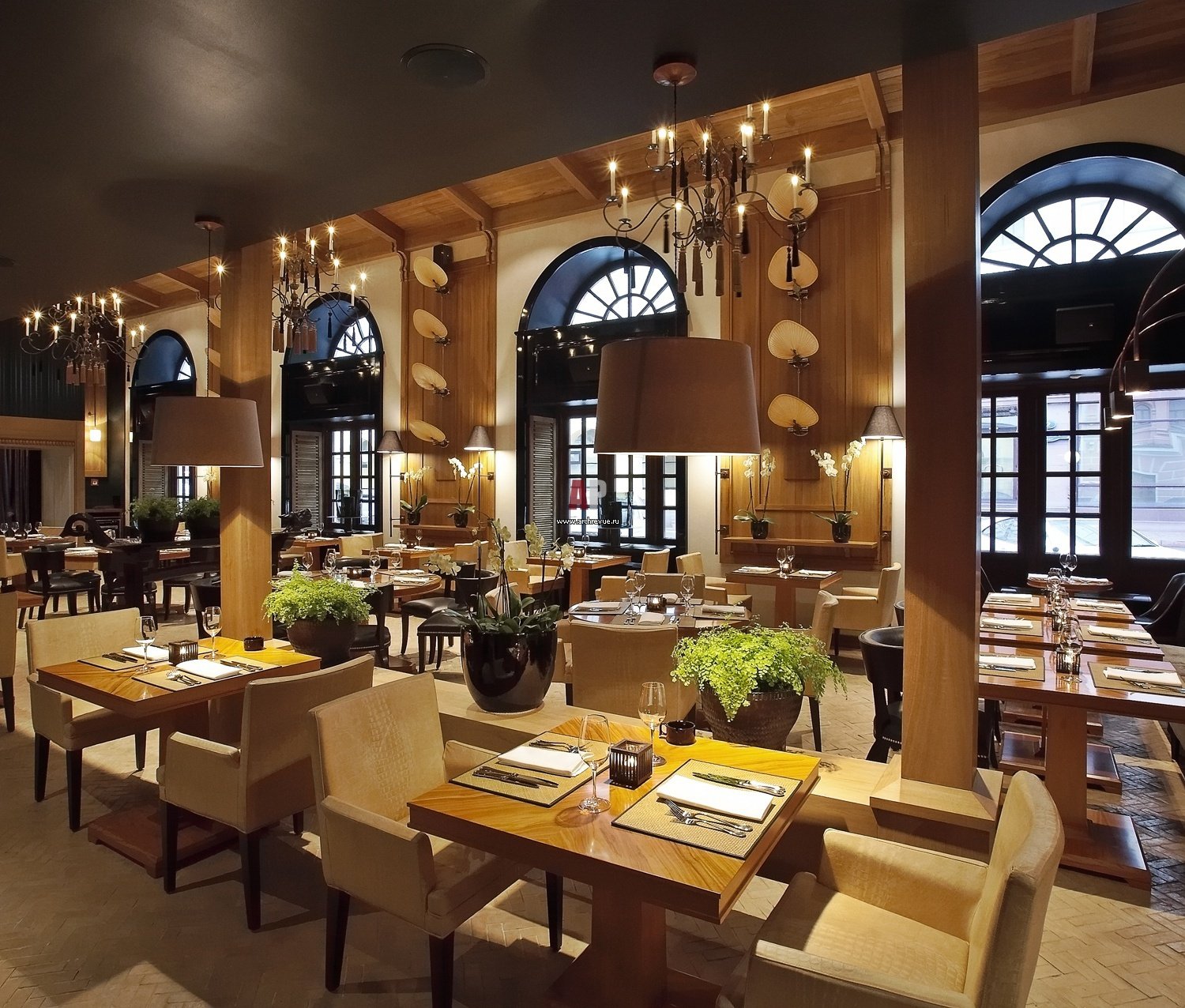 Оно не отвлекает гостей от ярких красок сада и моря. Акценты в интерьере расставлены преимущественно с помощью текстиля. Белоснежные скатерти указывают на высокий статус ресторана. Полупрозрачные занавеси оставляют окна открытыми. Драпировки и портьеры из ткани с цветочным орнаментом идеально гармонируют с цветущим садом, раскинувшимся вокруг ресторана.