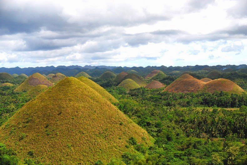 Шоколадные холмы – это более тысячи холмов конической формы, на которых растёт только трава, выгорающая к концу лета до шоколадно-коричневого цвета. С холмами связана древняя легенда о гиганте Арого, который полюбил смертную девушку Алойю. Когда она умерла, Арого рыдал, и его слезы превращались в холмы.