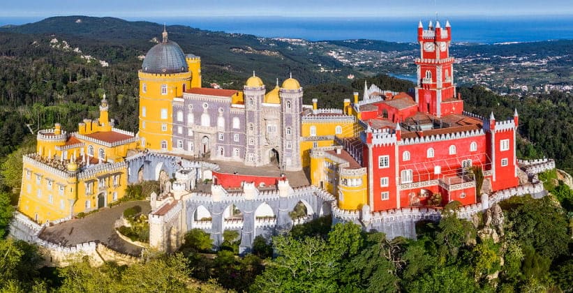 Luftaufnahme des Pena-Palastes im Sintra-Nationalpark, Portugal