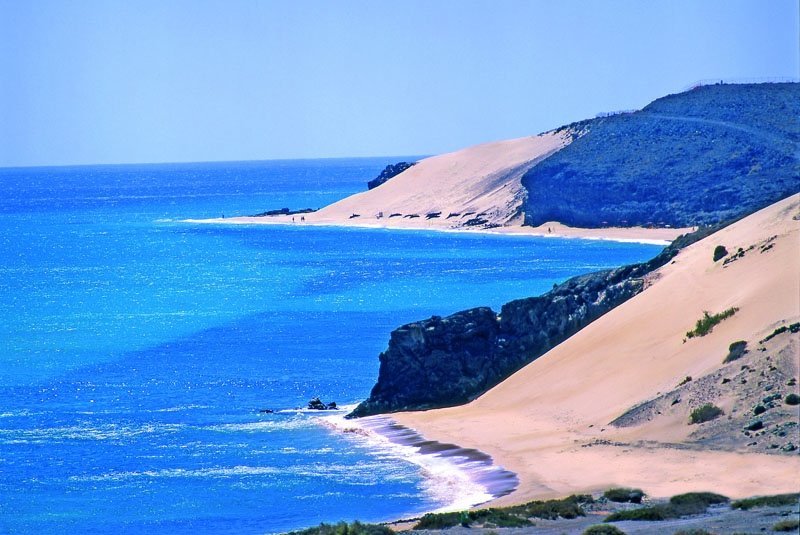 Из-за пустынных пейзажей этой части острова сложно представить, что в конце дюн расположен один из самых красивых пляжей всего архипелага, обладающий мельчайшим белым песком и омываемый морем бирюзового цвета.
