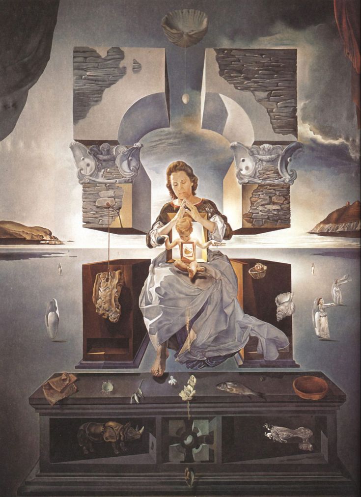Эта картина основана на картине Пьеро делла Франческа «Мадонна с младенцем, ангелами и шестью святыми», где Гала играет Мадонну. Никто не мог назвать Галу девственной или материнской, если уж на то пошло. Она пренебрегала ребенком, которого родила от своего первого мужа, французского поэта Поля Элюара (у нее не было детей от Дали, и в 1936 году ей пришлось сделать гистерэктомию из-за осложнений, связанных с миомой матки).