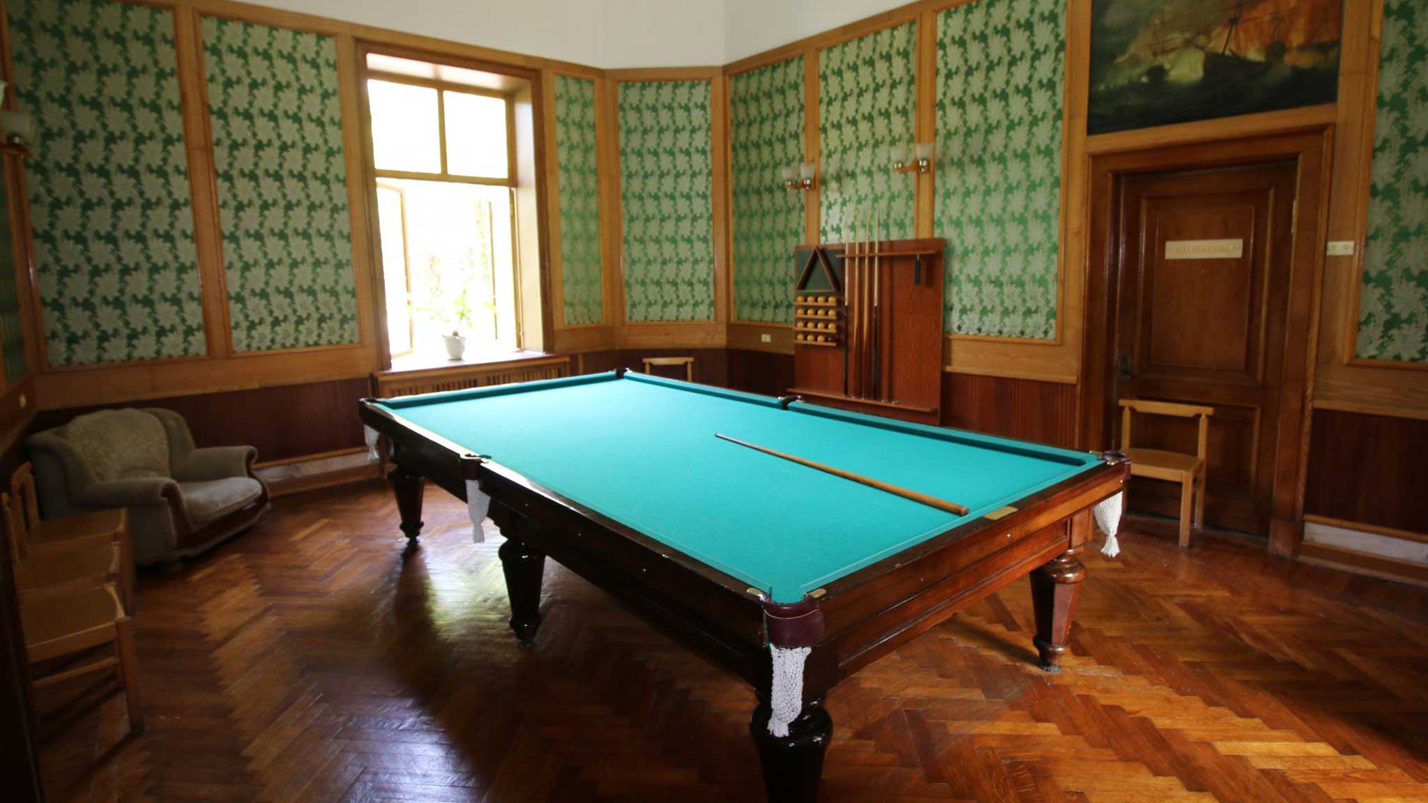 В бильярдной при реставрации заменили только обои и сукно на столе, все остальное — оригинал. Фото: dachastalina.ru