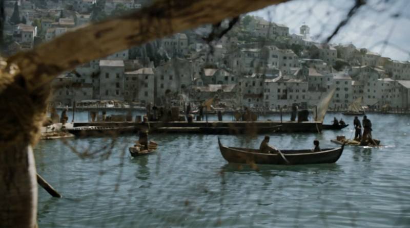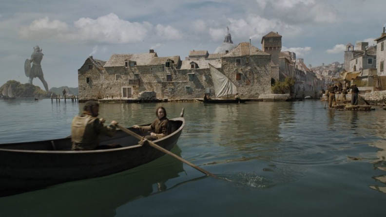 Арья прибывала по морю к стенам Храма Многоликого бога, чтобы пройти обучение. Пристань – настоящая, а вот храм полностью нарисован на компьютере. Позже на пристани Арья выдавала себя за нищую торговку устрицами, выслеживая врага.