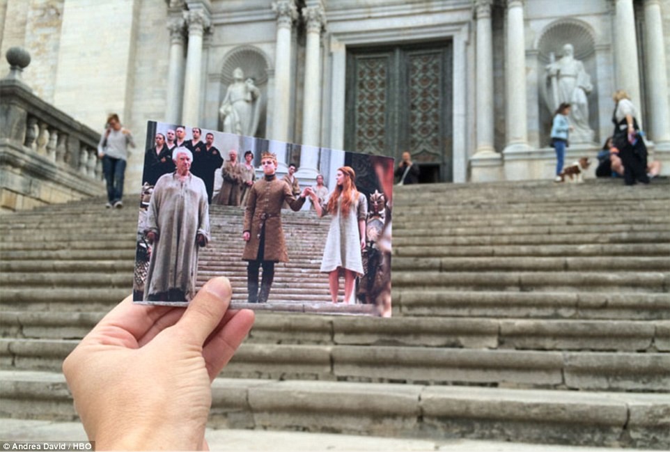 Впечатляющие ступени собора Жироны снимались в сцене, как ступени Великой Септики Баелора в Королевском городке Королевства.В сцене участвуют звезды Игры престолов Николай Костер-Вальдау (Хайме Ланнистер) и Лена Хиди (Серсея).