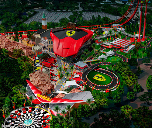 «Феррари Парк» в Испании – это развлекательный комплекс площадью 60 000 м². Ferrari Land отдает дань уважения знаменитому автопроизводителю и итальянскому наследию. В оформлении территории используется символика бренда, а многочисленные аттракционы окунают в атмосферу гонок «Фомулы-1» и знакомят с историей марки «Феррари».
