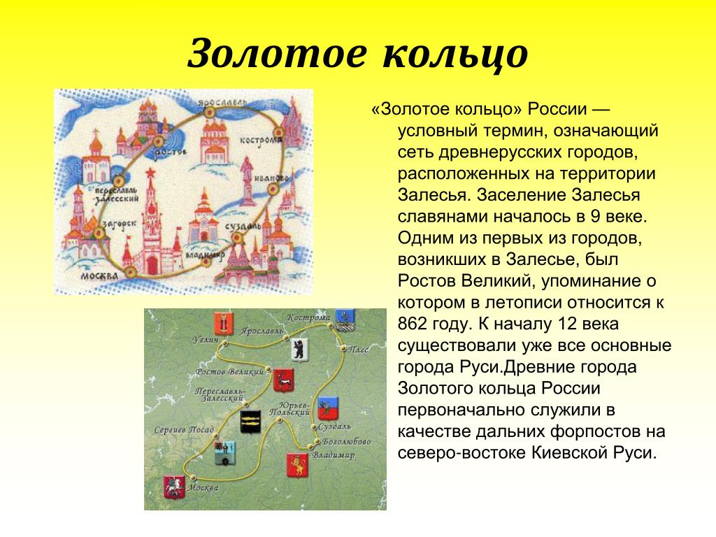 Золотое кольцо России состоит из восьми основных древних городов вокруг Москвы: Владимира, Суздаля, Иваново, Костромы, Ярославля, Ростова Великого, Переславля, Залесского и Сергиева Посада. Остальные города, такие как Плёс, Углич, Мышкин и др., Официально не признаны частью Золотого кольца. Владимир, бывшая столица средневековой России, выбран столицей Золотого кольца и открывает тур.