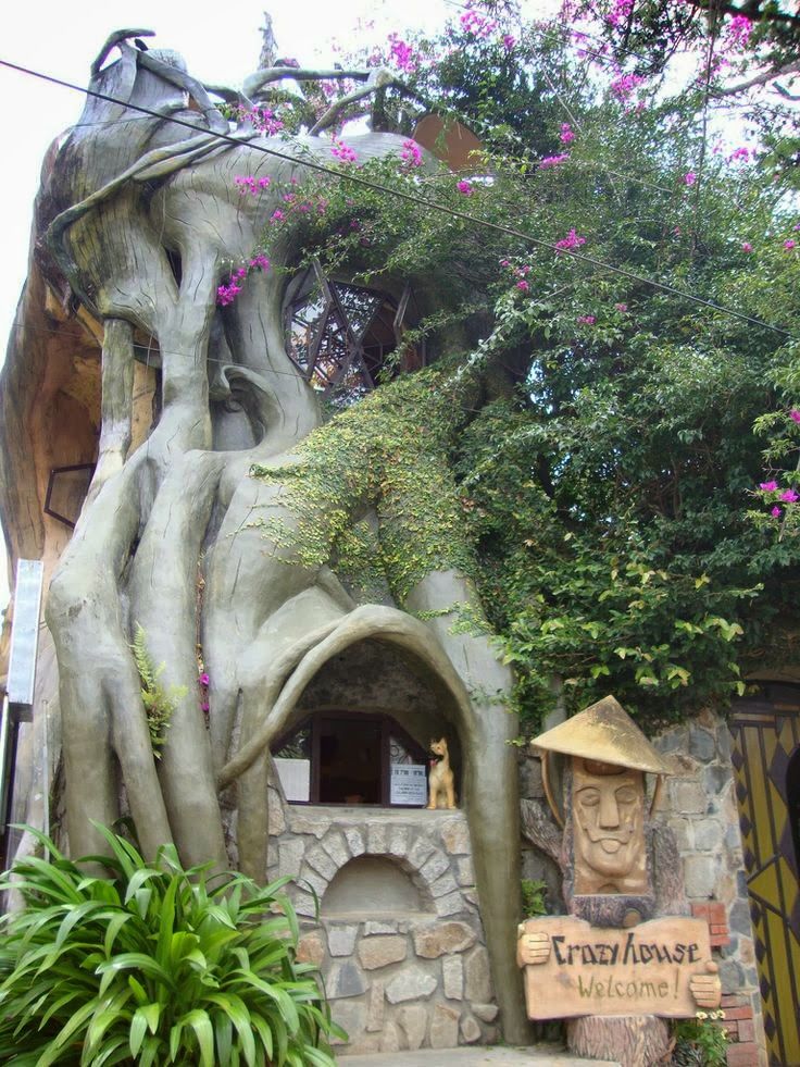 Крейзи Хаус в Далате (Crazy House) – это дом очень необычной архитектуры, входит в десятку самых необычных зданий в мире. Построен он в стиле «сказочного дома» и напоминает огромное дерево с переплетающимися ветвями, корнями, заросшее паутиной, поросшее грибами и живущими там животными.