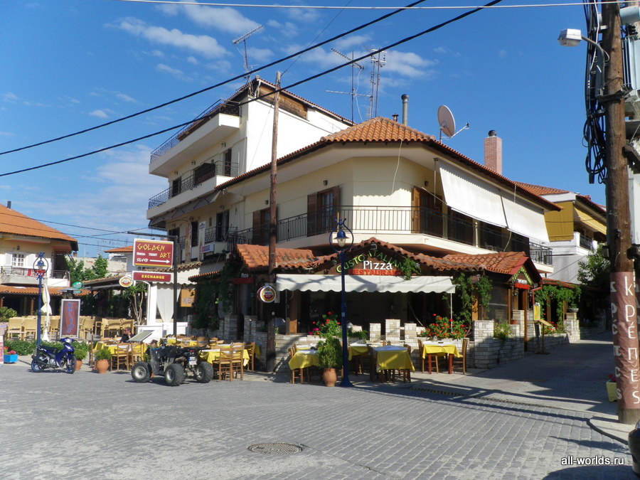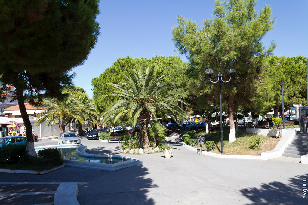 Его небольшая аккуратная главная площадь окружена кафе и тавернами, а в центре есть небольшой фонтан и бассейн.В нем есть цементные цветочные ящики, деревья и много побеленных низких цементных стен, побеленные ступени и побеленные стволы деревьев. За пределами площади есть множество небольших туристических магазинчиков, продающих вещи для пляжа или сувениры, а также большое количество семейных ресторанов, предлагающих блюда греческой и северной греческой кухни.