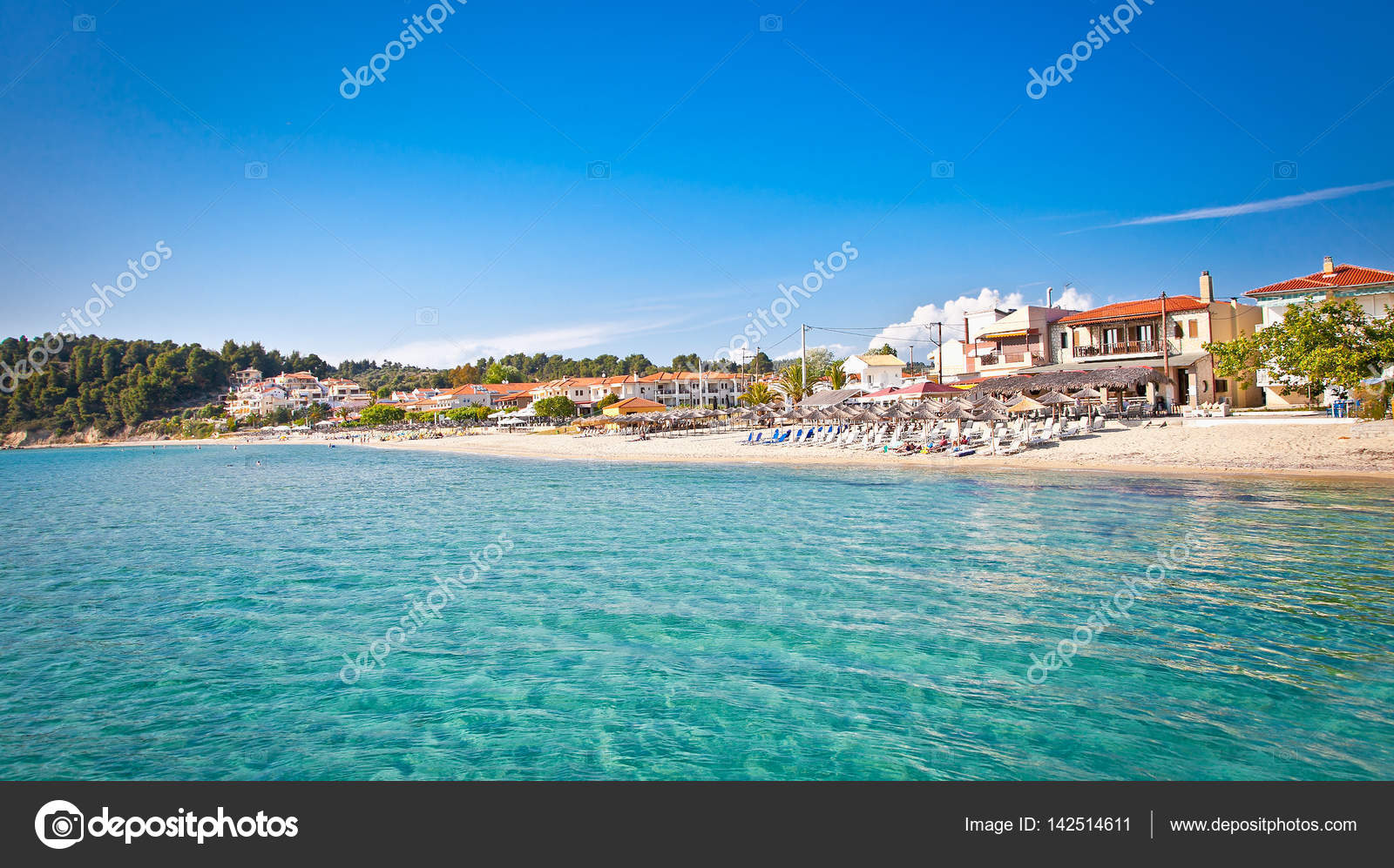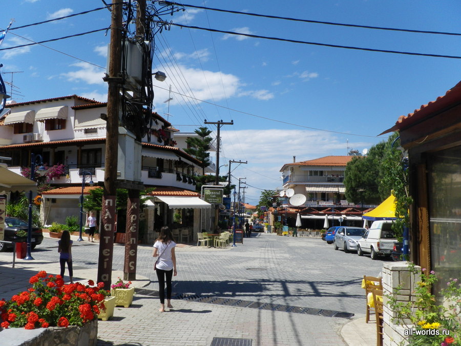 На побережье растут вековые сосны и банановые рощи. С побережья открывается вид полуостров Ситония и гору Афон.