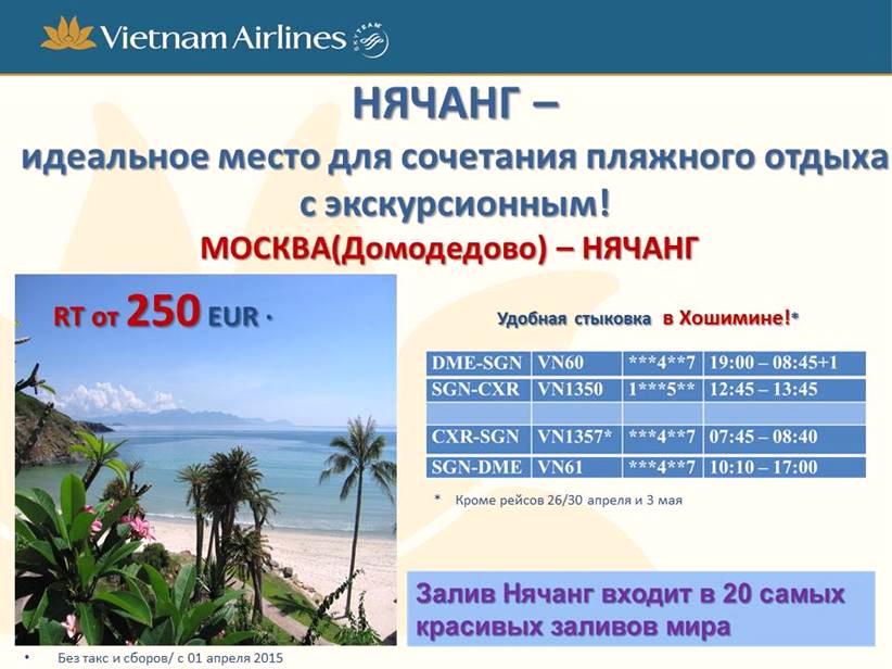 Многие авиакомпании регулярно проводят распродажи билетов с вылетом из Нячанга. Следите за такими акциями в наших социальных сетях. Кроме того, мы часто информируем вас о таких распродажах и специальных тарифах в наших еженедельных электронных письмах.