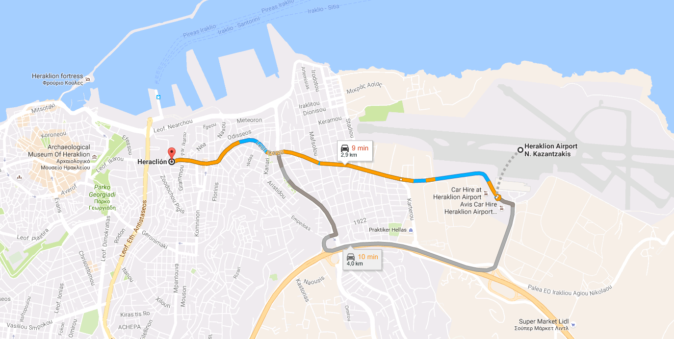 От аэропорта Ираклиона до центра Ираклиона около 10 минут.