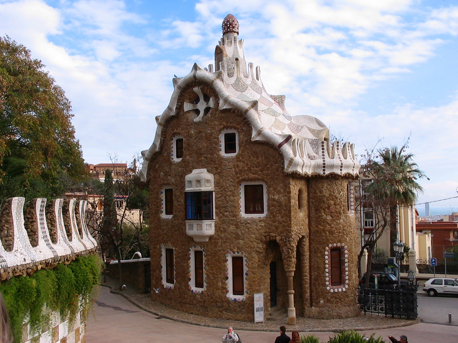 Как и во всех работах Гауди, здесь присутствует сильный элемент игривости. Домик смотрителя, показанный на этой фотографии за мозаичной стеной, представляет собой дом, который может представить ребенок, например, пряничный домик в Гензеле и Гретель.