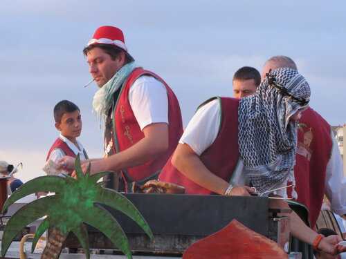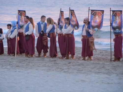 В субботу утром нас разбудила пушечная канонада — мавры брали пляж… эээ … или христиане его брали? Обычный фейерверк мы посмотрели из окошка, потом где-то час воюющие тупо палили из ружей друг в друга. Зрители терпеливо ждали рассвета или пили кофе в окрестных кафе или общались с приятелями. Мы заняли сторону мавров, стоять и занимать место с шилопопым максом у нас шансов не было, а у мавров было поспокойнее в плане народу. Опять же они подтащили полевую кухню 🙂 ,да и в кафе рядом с ними были свободные места.