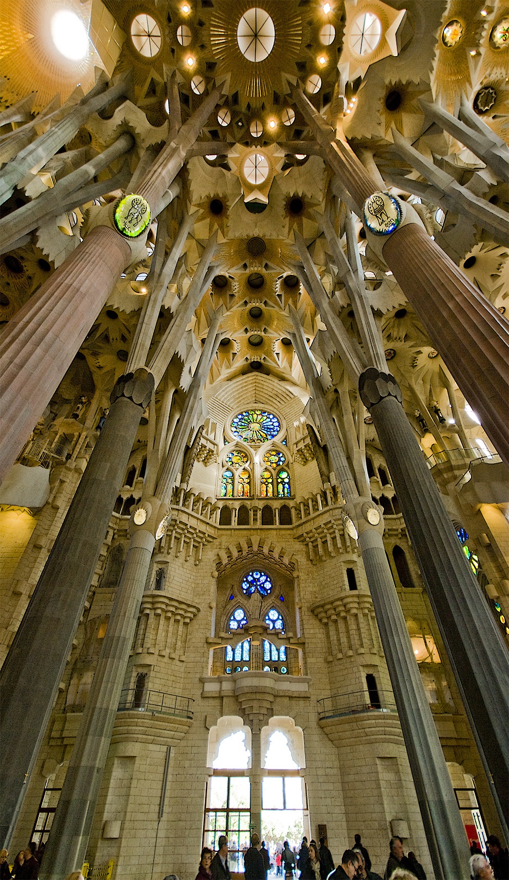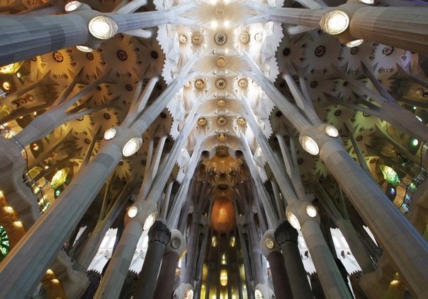 Богатое воображение Гауди делало его творения поистине уникальными – в работе автор стремился придерживаться естественности, и храм Святого Семейства не стал исключением. По замыслу проектировщика, колонны, которые являются главным несущим элементом здания, по мере приближения к сводам разветвляются, образуя фантастическую конструкцию в виде леса. Солнечный свет, падая внутрь храма сквозь размещенные на разной высоте окна, создает ощущение того, что сквозь ветви деревьев пробивается сияние звезд.