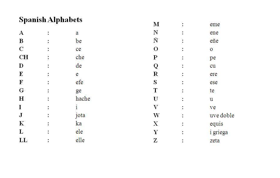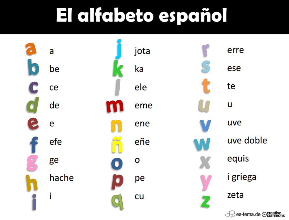 Испанский алфавит (alfabeto o abecedario) состоит из 27 букв: 22 согласных и 5 гласных букв.