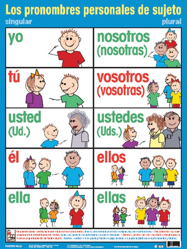 В таблице ниже представлен обзор испанских личных местоимений. Обратите внимание, что местоимения третьего лица единственного числа и все местоимения множественного числа имеют разные формы для мужского и женского рода. человек тема прямой объект косвенный объект предложный Английский перевод единственное число 1 ст человек лет я м я, я 2 й человек и тэ и вы (неофициальный) б/у* ло/ла ле, се используется* вы (формальный) 3 рд человек или вот или он, он элла ла или она, ее во множественном числе 1 ст человек носотрос № носотрос мы, нас (мужской род) нозотра носотра мы, нас (женский род) 2 й человек восотрос ос восотрос вы все (мужской род) восотрас восотрас вы все (женское начало) б/у* лос/лас лес, SE используется* вы все (официально) 3 рд человек элло лос элло они, они Эллас лас эллас * Usted и ustedes являются формальными.
