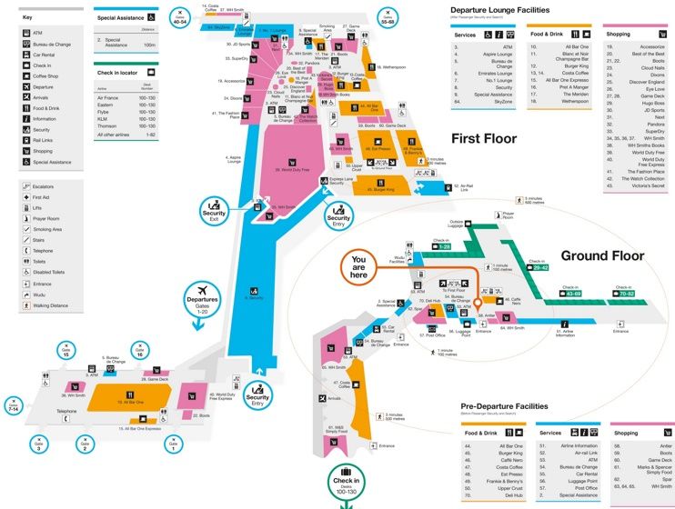 Здесь, помимо основных услуг, пассажирам предлагается также масса развлечений на любой вкус: магазины беспошлинной торговли, модные бутики брендовой одежды (Burberry, Harrods, Montblanc, Salvatore Ferragamo), несколько ресторанов и баров, детские игровые комнаты, массажный кабинет и мн. др.