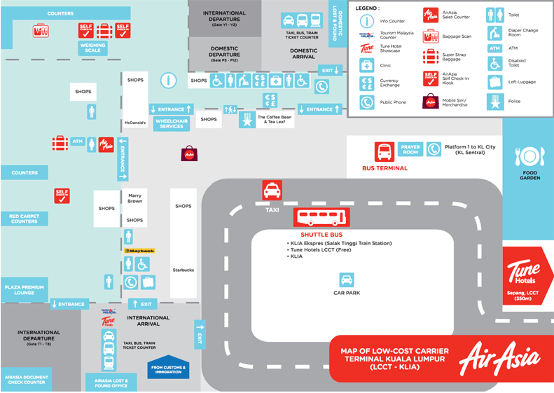 Схема аэропорта Куала-ЛумпураВ аэропорту 3 терминала: основной Terminal 1; вспомогательный к главному Satellite terminal A, а также терминал LCCT, обслуживающий бюджетные авиалинии.